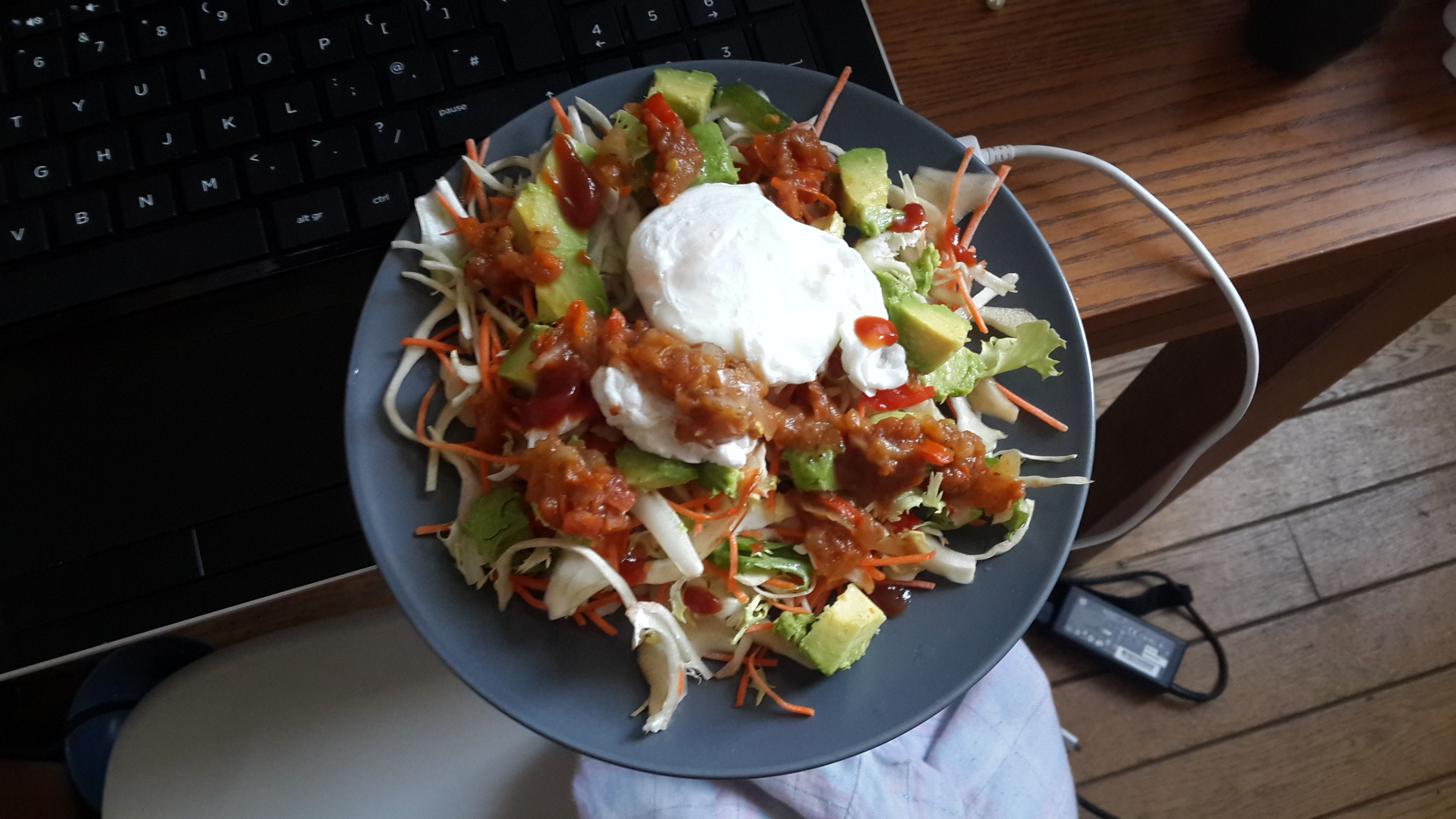 I tried out one of their recipes (the picture above). I say ‘tried’ very liberally, because there are many variations in my finished product. Instead of fresh vegetables for the salad, I just used store pre-prepared salad (which you shouldn’t do ;-)). My poached egg didn’t come out as perfect as his, but it was alright. I added a bit of tomato and pepper sauce which I had made before thinking the salad might be bland (but it wasn’t at all [even without the sauce]). I added avocado and made the salad a sort of hybrid of two of their recipes.
