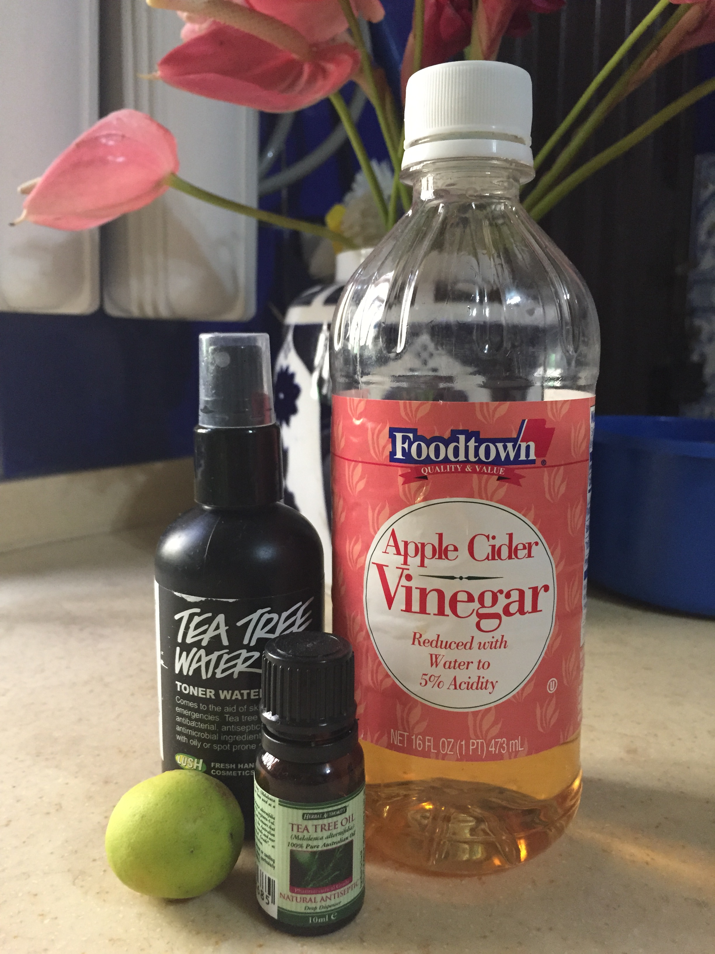So, I bought a small vial of tea tree oil, it occurred to me that I could add some lime juice (I’ve used that before on my face), and went online to see what ratios I could use to make a mix. I stumbled on this great article which has 5 different homemade options. Of course, I picked the tea tree one. What was more? The article suggested adding apple cider vinegar (ACV). And guess what? I had just bought a bottle recently for use on my hair, so of course I was stoked.