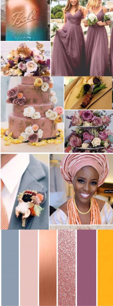 How did I come to this conclusion? After spending a few weeks trying to select bridesmaids styles, figure out aso ebi, and plan bridal shower, I started dreaming about these things (for real, for real). So, I found myself up awake at 5 am one morning consumed with the need to find out what the colour mauve looks like. And from there, down the rabbit hole, I went. I spent the next three hours (no jokes) selecting complementary colours and putting together a wedding palette for myself. Myself o – me with no ring or anything close to that. But guess what? Now, I’m all sorted for my big day if/when it comes! I present to you the mauve-livid(greyish-blue)-rose gold-mustard yellow-blush-copper weeding palette.